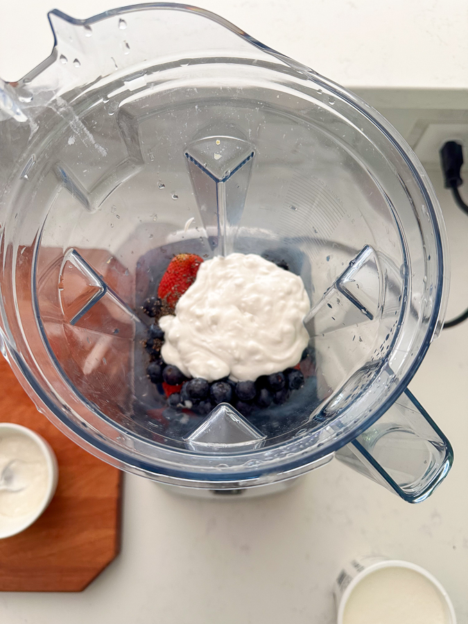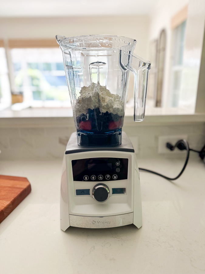 - Add washed fruit, cottage cheese, 3/4 of coconut whip, and chia seeds to a blender and blend until combined. Keep remaining coconut whip for topping.