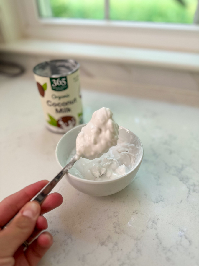 Open can of coconut milk and drain off liquid (you may need to use a spoon to poke a hole). The more you drain it, the thicker it will be and if you’d like it to be the most whipped cream like, you can whip it with a whisk or mixer.