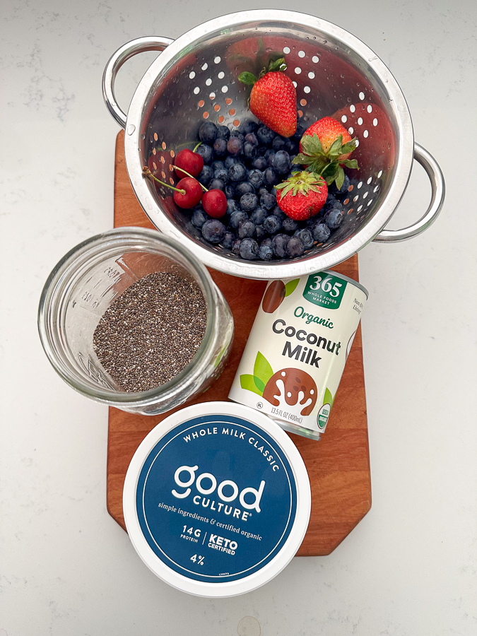 This cottage cheese fruit salad gets it’s “jello” from chia seeds, its cool whip from coconut cream, and is way healthier for you using fresh organic berries and protein-packed cottage cheese! I prepped it in mason jars so it would be single serving chic, but you could also use a serving bowl or trifle dish too.