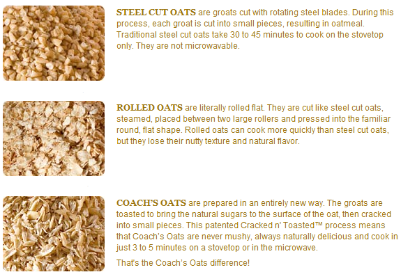 Have you ever heard of Coach’s Oats? Coach emailed me to say that as the Dutchess of Oats I had to at least try every kind of oat out there. I’ve had steel cut before – not a huge fan. They just don’t cream and fluff up like I like and the cooking time is just not worth the wait! I like Scottish [ground steel cut] and old fashioned rolled oats the best. Definitely not a fan of instant!