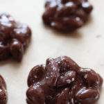 - Line a second baking sheet or small tray with parchment paper. Spoon the nut + chocolate mixture onto the sheet, making them about 1 heaping tablespoon in size. Sprinkle with sea salt.