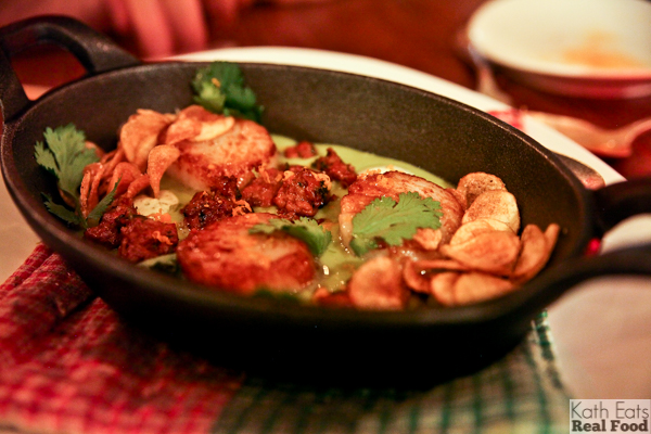 And finally the scallops with a chorizo, peas, crispy fingerling potatoes and creama.