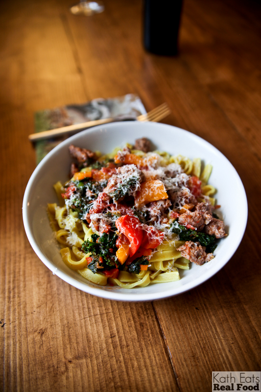 Dinner tonight was a party – Uncle Jeff came over, and we popped open some bottles of wine and jazz to celebrate the weekend. Earlier we picked up some sweet Italian sausage and Mona Lisa Pasta and had this dish with peppers, kale and marinara. Delish! Always love fresh pasta.