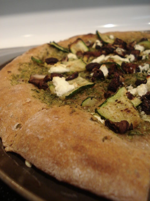 Matt (Larbs’ Matt) had a soccer game near our house so we invited him for dinner 🙂 The husband said he was in the mood for pizza, so pizza it was. But we decided to do something more nontraditional: Cilantro Pesto with Mushrooms, Zucchini, Goat Cheese + Parmesan. He used the Grilled Flatbread Recipe for the dough, but multiplied it by 1.5 (and used whole wheat flour for the addition). It was our most perfect pizza dough yet! I made the cilantro pesto by whirring a bunch of cilantro in the Cuisinart with a handful of walnuts, about 1/4 cup parmesan and 1 tbsp olive oil. The veggies were grilled before they were added.
