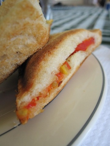 A tomato + cuc griled sandwich and a cheese + lettuce sandwich half –