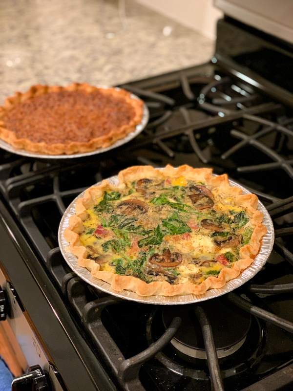 Matt and Mazen made us a delicious quiche for dinner! Along with a pecan pie. The quiche (based on this recipe) had mushrooms, bacon, spinach, and goat cheese and was so good. The homemade crust is the best part.