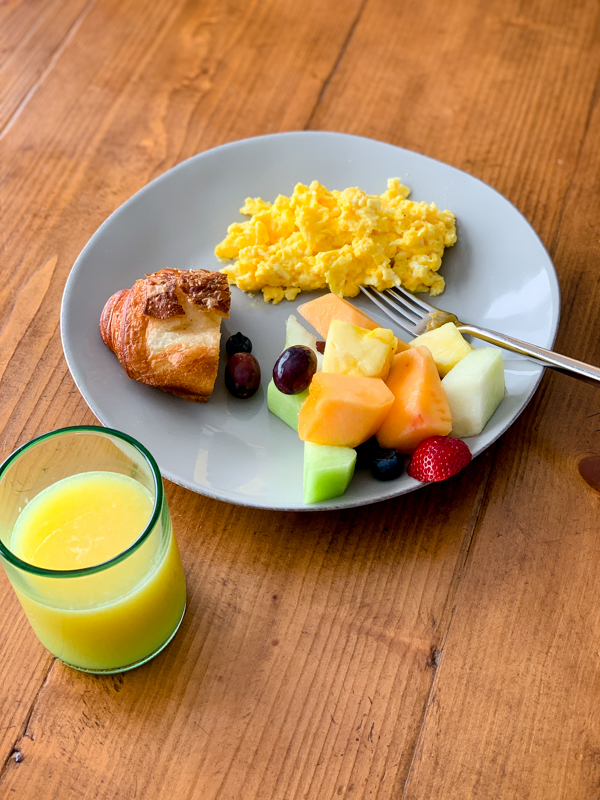 Breakfast of champions: cheese eggs, chocolate croissant, fruit, OJ, coffee. I wake up starving from a night of nursing!!