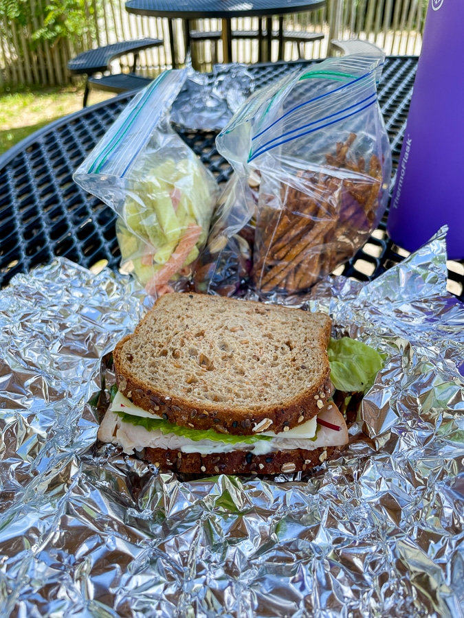 Thomas and I had turkey + cheese sandwiches, and Birch had a PB&J. We shared pretzels, trail mix, and veggie straws. And Mazen the 8-year-old bought a hot dog and fries (!).