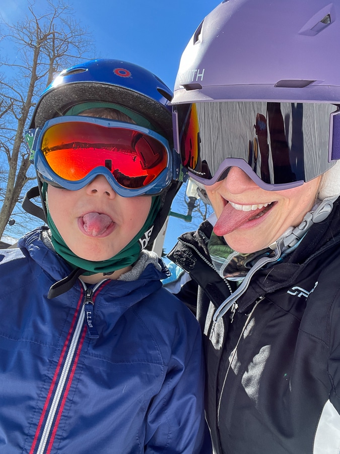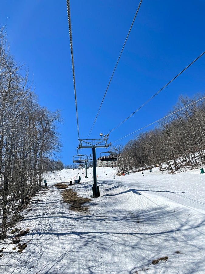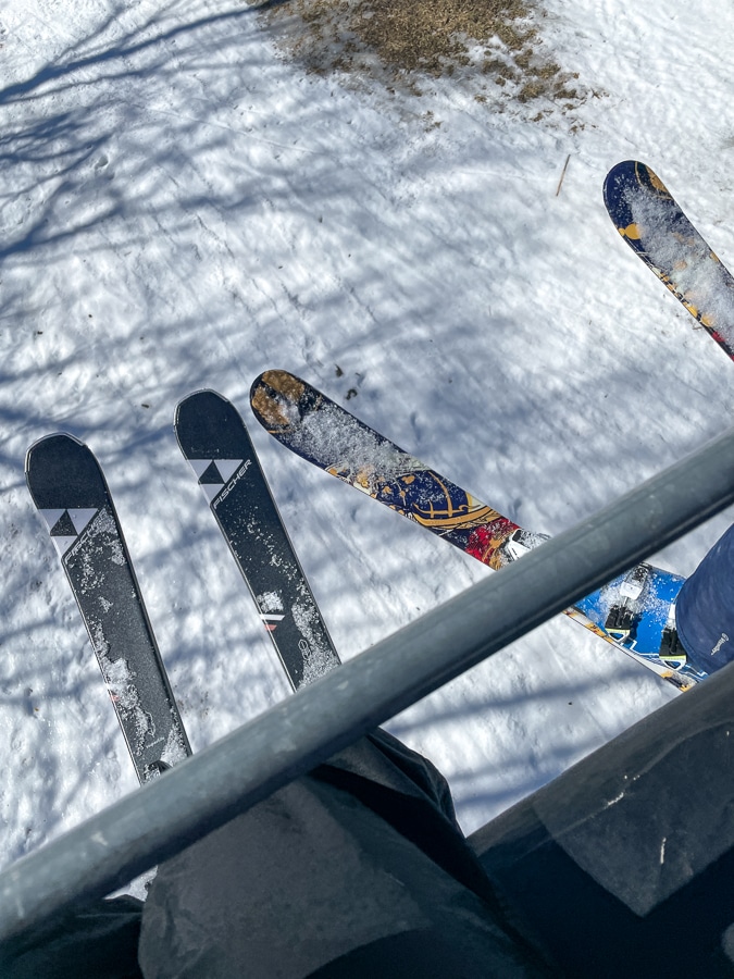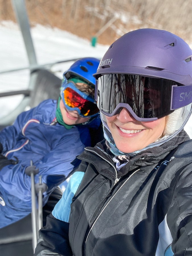 I was a little nervous to be the one in charge of all the logistics – parking, gearing up, getting to the slopes safely while carrying our skis. Put two anxious people together and you start to melt down! We went slowly, hit the bathrooms, and went straight to the slopes since we bought our tickets online. (Of course my lift ticket card was invalid when I got to the bottom but they let me through to get it fixed!)