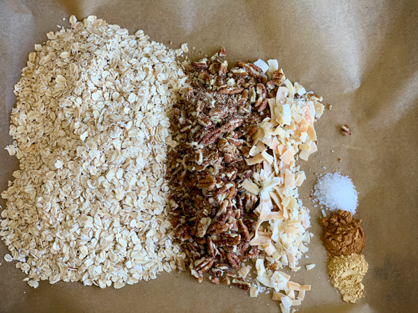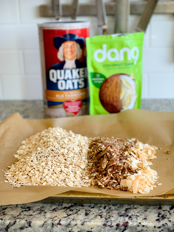 Like whole grain oats, pecans, and coconut flakes! I love these toasted ones by Dang, but you can use regular coconut too or sub in something else.