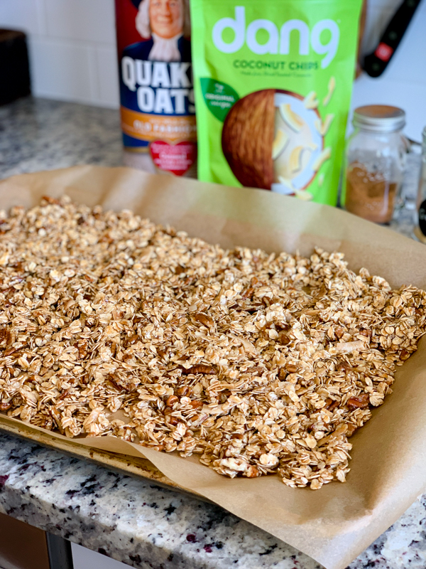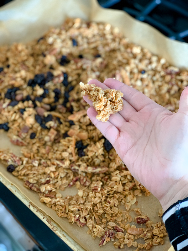 I promised you guys I’d share this recipe for the most delicious granola I’ve ever had. My neighbors brought me a tupperware of it the week Birch was born. I immediately asked for the recipe! My neighbor said it was from a magazine a decade ago and she’s been making it ever since. I made just a few changes to simplify the recipe and call it my own. It’s so easy you can make it with a sleeping baby on your shoulder!