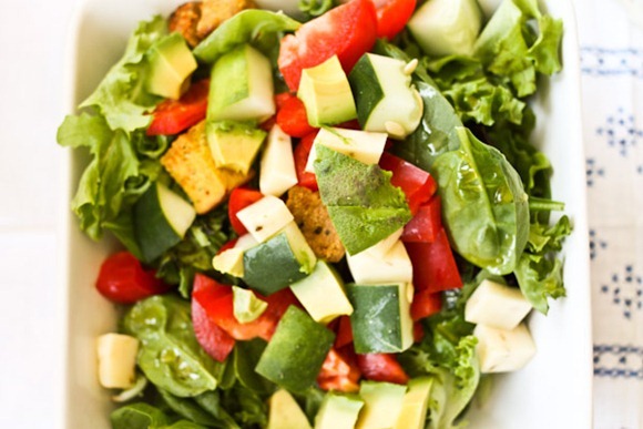 Lettuce, cucumber, pepper, avocado, pepperjack cheese, 4 leftover cubes of tofu with olive oil and lavender salt for dressing