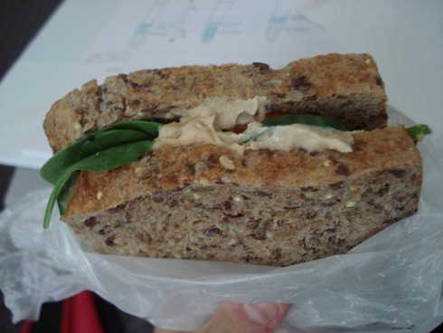 It was an AWESOME sandwich!! 2 slices of the good bread, plus sabra hummus, cuc, pepper and spinach. I was skeptical that a single sandwich would cure my hunger, but it held me over for about 4 hours! Must have been the dense bread.