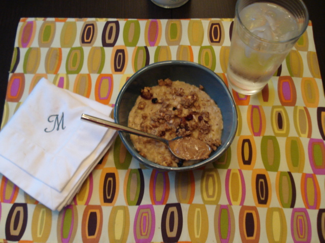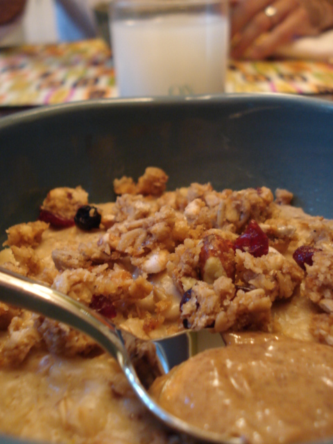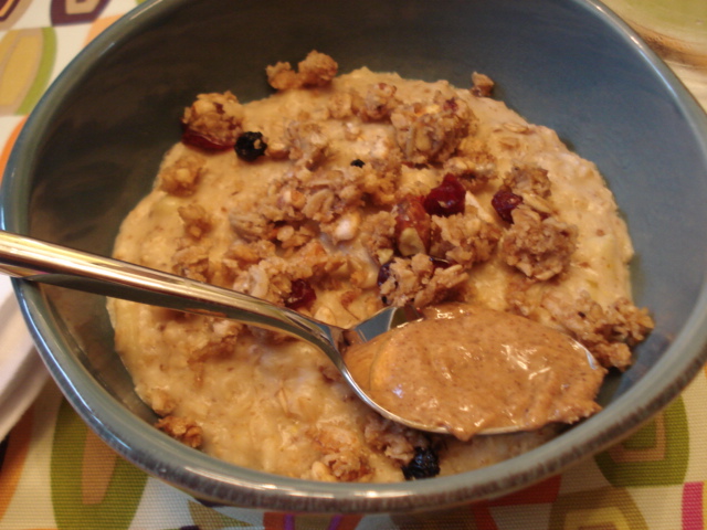 Out of wheatberries as well so I made 1/2 cup portions with skim/banana/flax/vanilla topped with blueberry granola plank and almond butter –