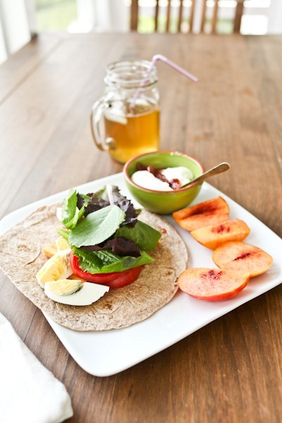 What I do know it is: a whole wheat tortilla filled with cheese, hard-boiled egg, tomato, greens and salt. It was delicious and gone in 2 minutes!