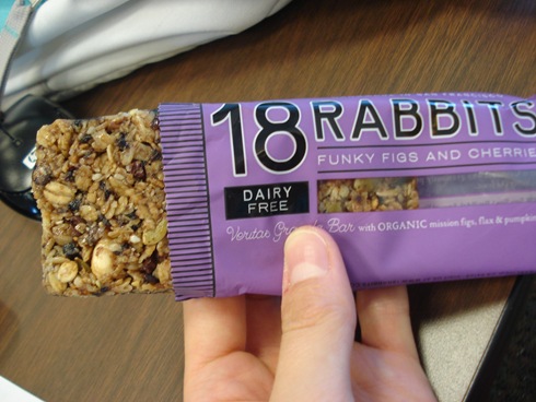 I spent the afternoon in the Graduate Studies Room….studying. And I still have more to do, including more studying for my first Organic quiz tomorrow!! sp3, sp3, sp. Sigma. Pi. Double pi. Anyway, while I was there I munched on a Jimmi bar: 18 Rabbits. It was good, and big, but not worth all 220 calories in my opinion. I would have preferred it slightly smaller. While it also tasted great (loved all the chewy oats and nuts), I was still kinda hungry when I finished. It didn’t have the heft of LaraBars.