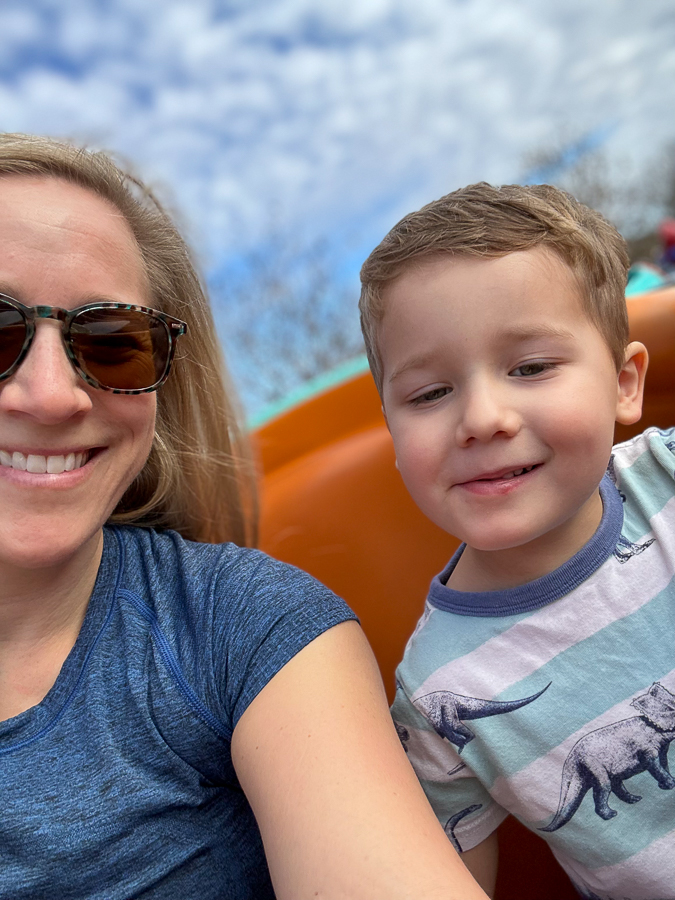 The Barnstormer is a great kids’ first coaster, and my sister’s kids loved it, so we hopped right on with Birch. He did NOT like it at all! He said he’s never going on another coaster again in his life.