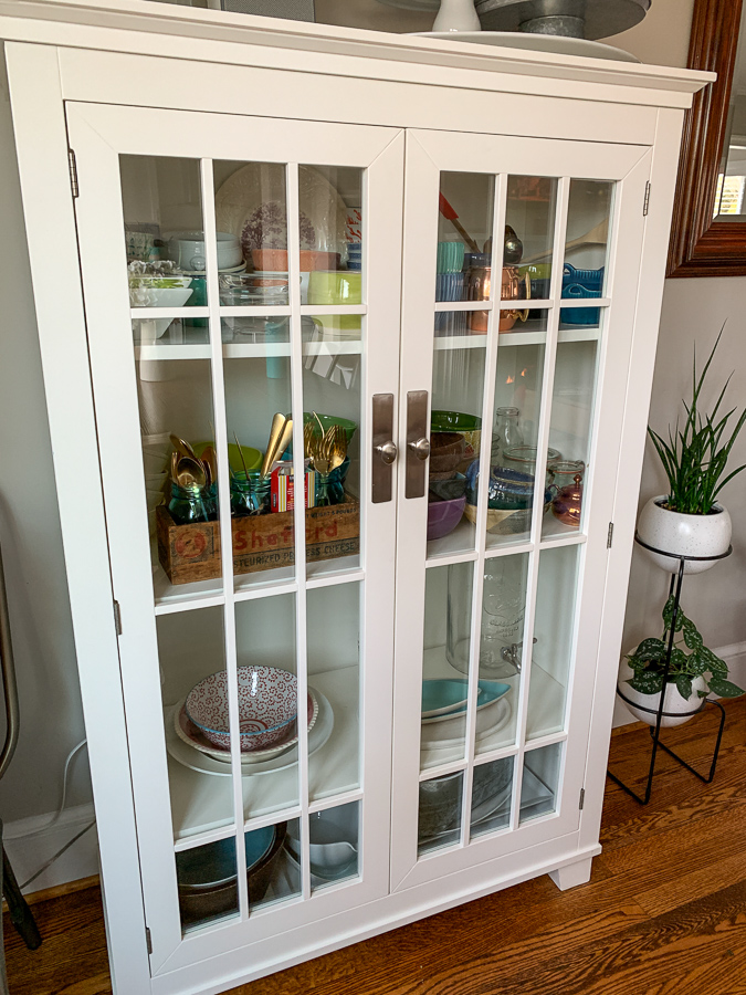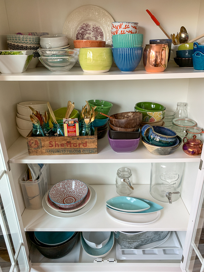 The upstairs, taller one has stored my bowl and entertaining dishes for years. Something about it always bothered me a little bit, and I think the problem was the mix of colors, shapes, and sizes of dishes inside. Plus the fact that no matter how many times I try to pare down my dishes, new ones always appear as gifts and I end up stacking more and more inside.