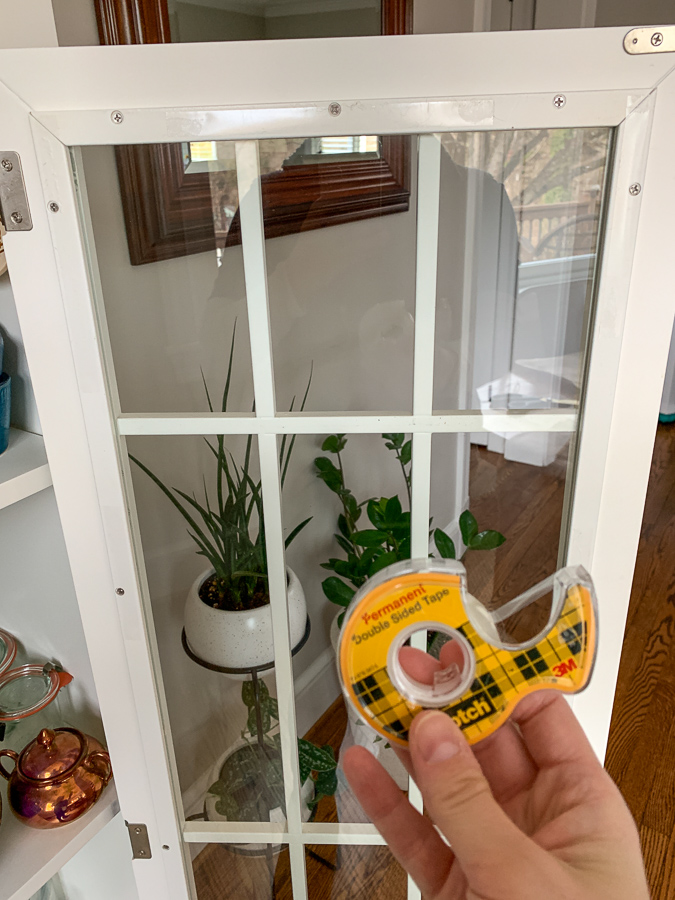 I’ve been wondering what to do with my cabinets with the same issue. I’ve been thinking of spray painting the glass but this idea is adorable and cleaner to do. Thanks!