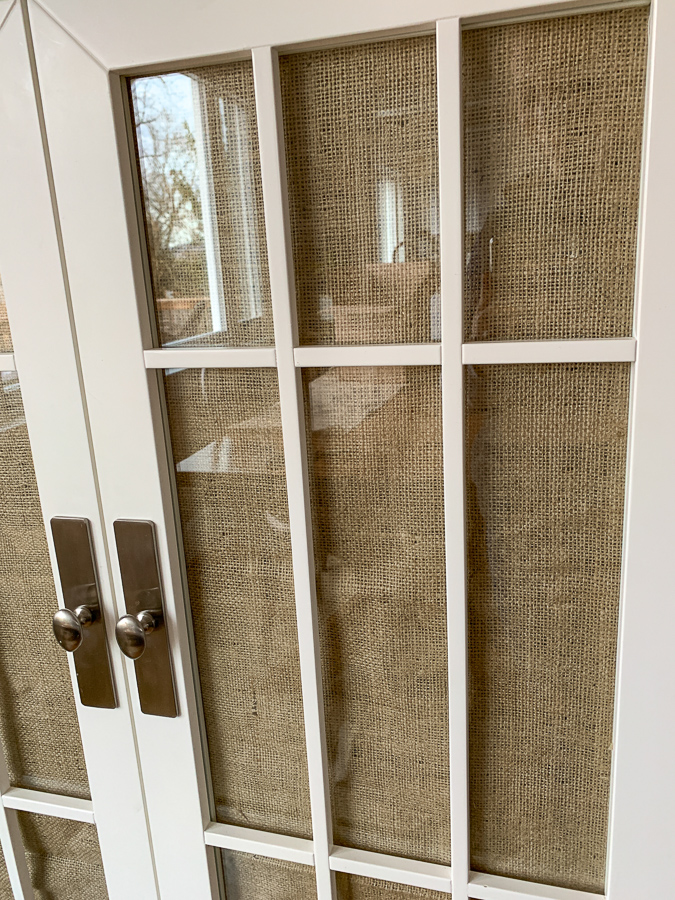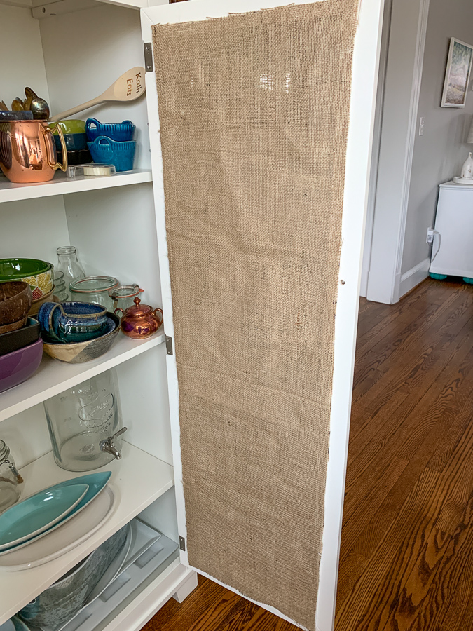 Because these go inside a cabinet that doesn’t get used a lot, I simply used double sided tape, just like I did with the cabinet downstairs that I burlapped in 2014. I’m happy to say that the shorter cabinet’s tape is just fine, so I’m hoping the new one will stand up to normal use too.