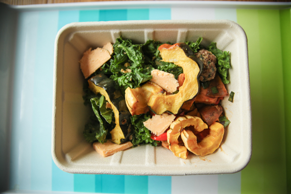 Salad lunch from Whole Foods supplemented with leftovers from home (squash, cheese, meatball)