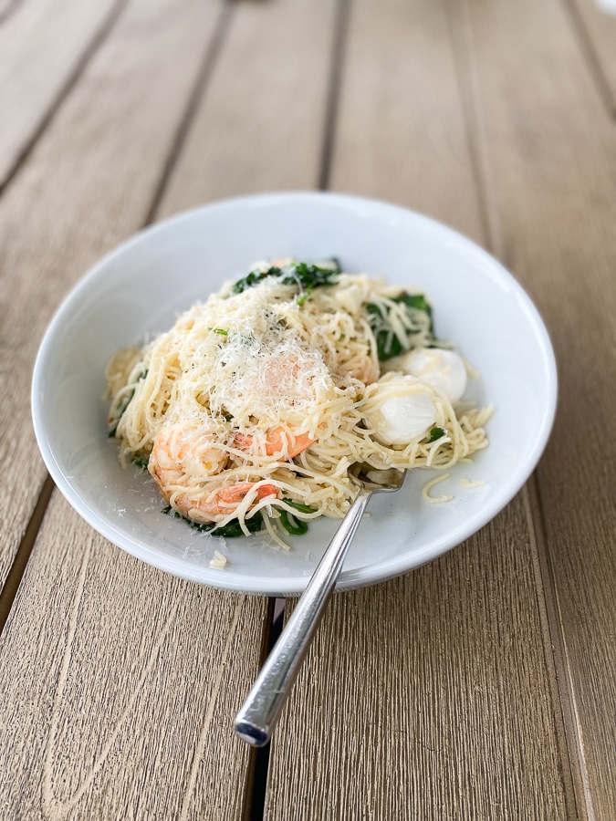 Leftover shrimp scampi = always just as good the next day! (+ two mozzarella balls!)