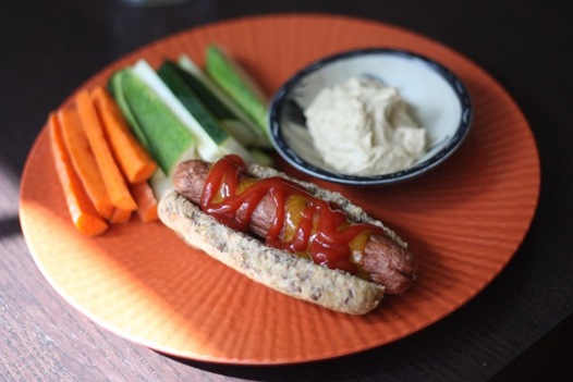 Congratulations on the nomination! Your lunch looks so summery – I love to dip my veggies into hummus, and sausage/hot dogs are delicious 🙂