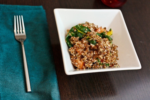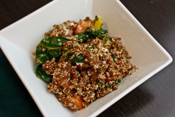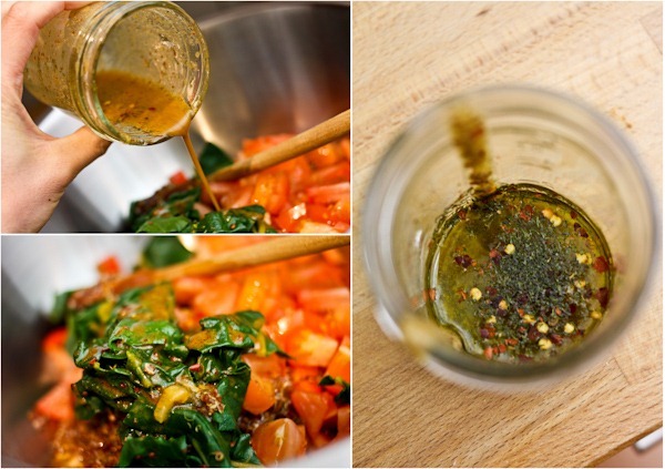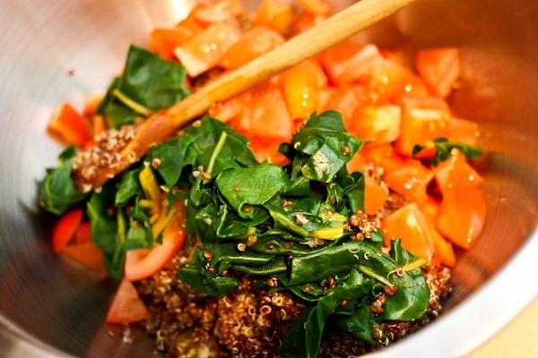 This salad combines red quinoa with chard, pepper and tomato. On top a lemony soy mustard dressing adds tons of flavor