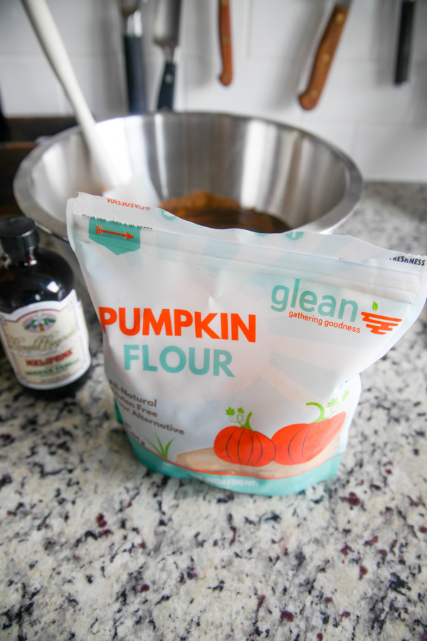 When I went to reach for the whole wheat flour, I remembered the folks at Glean had sent me some of their pumpkin flour to try. It’s literally flour made from pumpkins – that’s the only ingredient. It fits in a lot of diet patterns like paleo, gluten-free, and vegan too. I wouldn’t call it super delicious – it’s not sweet or anything – but it’s definitely nutritious!