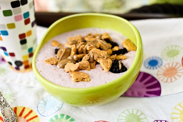 Yum! Coincidentally,I had almost the same breakfast this morning! I had oats soaked overnight in unsweetened chocolate almond milk, and then blended with frozen banana, a fresh peach and a bit of flax. I even put sunflower butter on top!