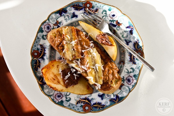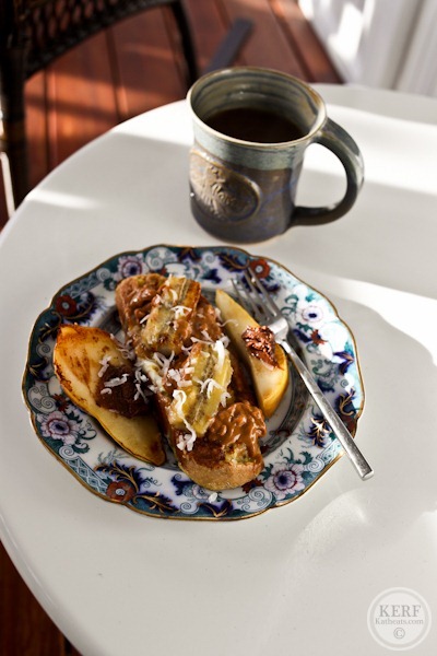 Apple Scrapple french toast, seared banana and pear, TJ’s peanut butter and some Justin’s Chocolate Almond on the pear, plus coconut to garnish. It was the perfect Sunday breakfast!