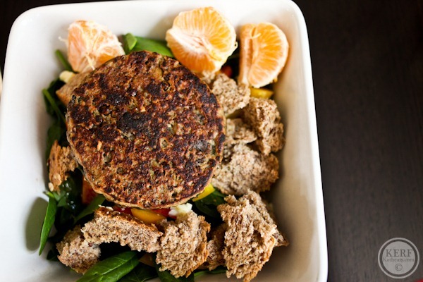No Bull Burger over salad with pre-chopped veggies, Seaside Cheddar, Cville Crunch bread pieces, olive oil, salt and a clementine.