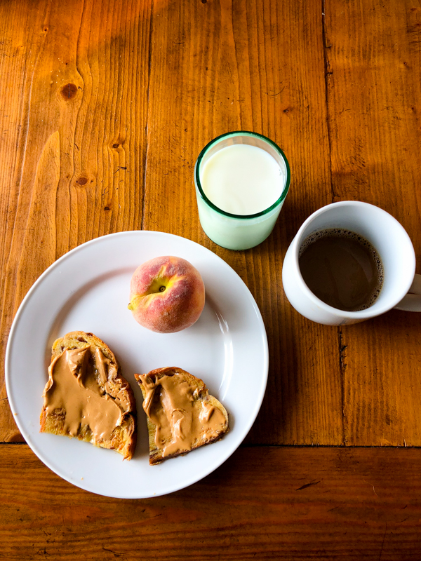 Simple little breakfast: leftover french toast with PB, peach, milk, coffee.