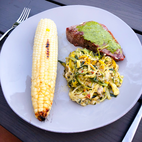 NY Strip steaks + corn on the cob + Jami’s pesto mozzarella zoodles. I made the chimichurri sauce with lots of cilantro, parsley, oregano, jalapeno, a little vinegar, olive oil, lime juice and S+P.
