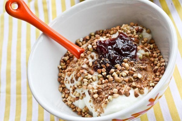 Yogurt with jam, flax, AND toasted buckwheat? Sounds like the perfect combination of flavors to me. Some sweet, some crunch, lots of texture. I’m about to go see if I can find any of those ingredients here…