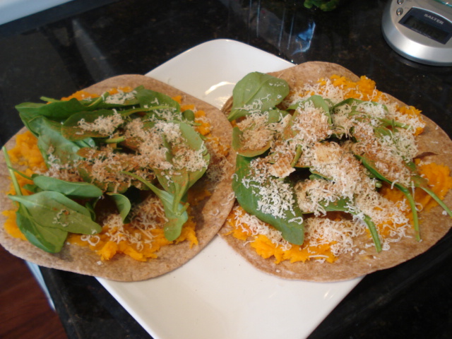 Basically I topped 2 tortillas with 6 oz of leftover roasted butternut squash, 2 handfuls baby spinach, and 15 grams grated Parmesan cheese (the expensive stuff!), plus a sprinkle of cinnamon. Then I cooked it on my pancake griddle for 5 minutes per side. Fantastic!!