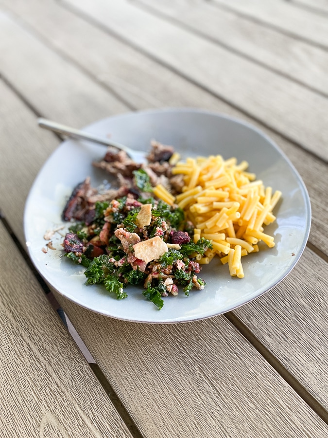 Leftover BBQ, leftover Roots salad, and boxed mac and cheese! One of those nights…!