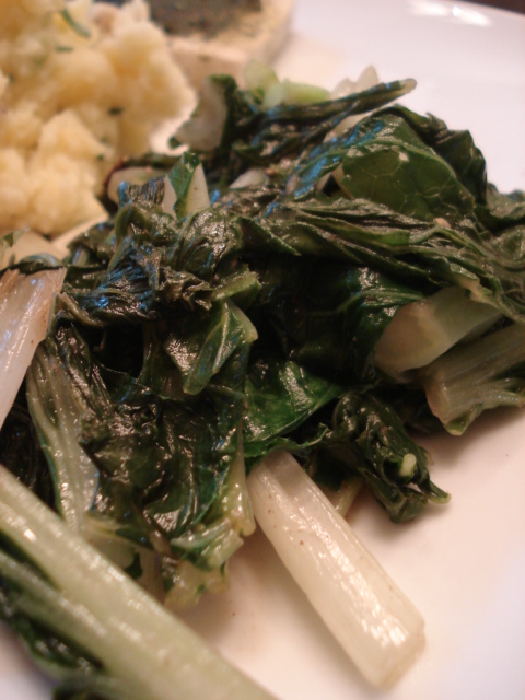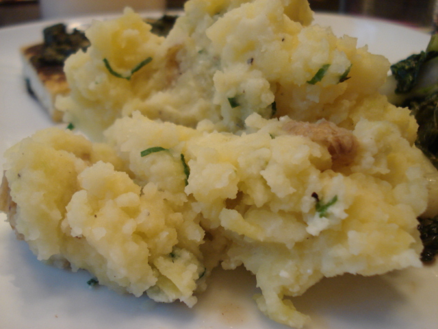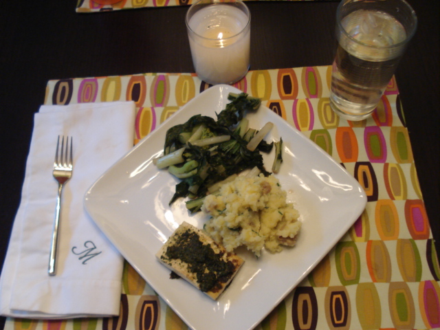 We used up the last of the CSA delivery tonight: garlic chives (a big step for me!) in smashed yukon gold potatoes and a green similar to bok choy . Along with leftover tofu + pesto, it was quite a green meal !