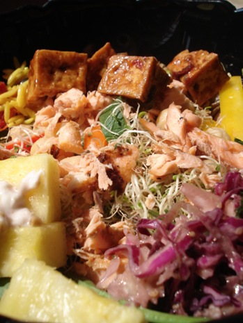 I thought about getting soup (there was heavenly smelling shrimp + corn soup) or a wrap, but I just love the variety of salads so much I got one instead – with a little of the best tofu in the world and the best salmon in the world. I did cut back on the heavy ingredients and this salad only cost 2/3 of last weeks