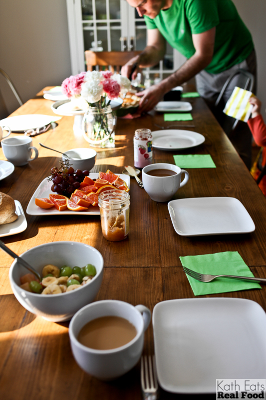Larbs, Matt and I did this bootcamp in the living room. Then we showered up and got started on brunch. Kanz made a quiche, and we had toasted pecan swirl bread, fresh fruit, OJ and lots of coffee.