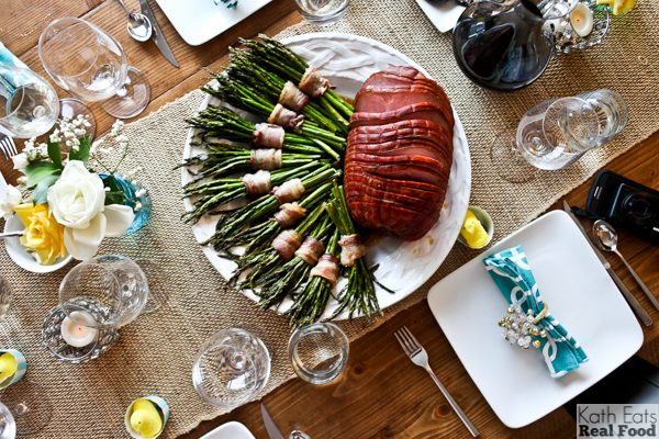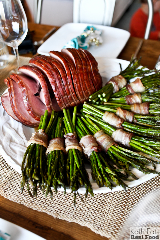 Our menu this year included a spiral honey ham with asparagus bundles wrapped in bacon.