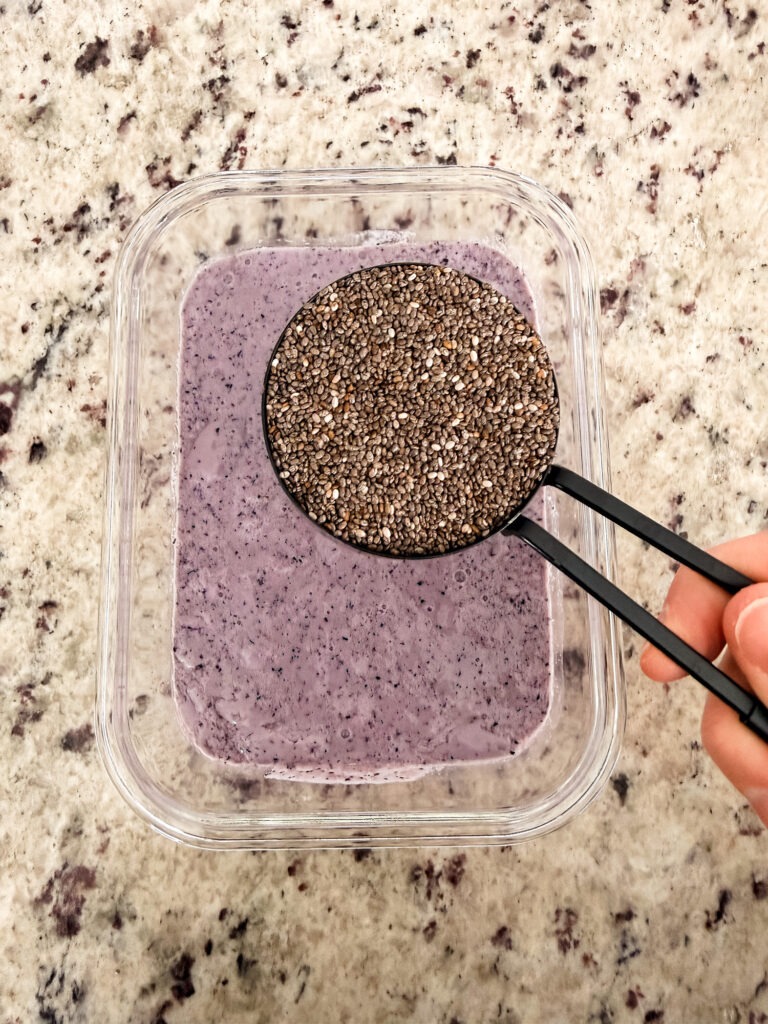 A good rule of thumb is 1/4 cup chia seeds to 1 cup liquid. Note if I’m using yogurt or more fruit, I’ll bump the chia to 1/3 cup.