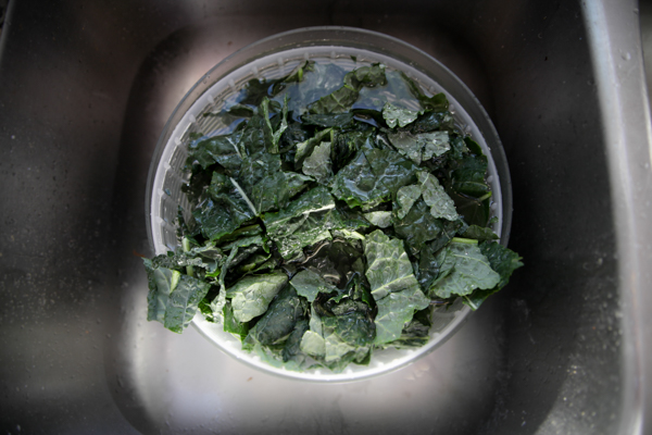 - Remove stems from kale and chop into bite-size pieces.