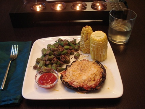 We went to the grocery store and came home with 3 vegetables that looked good: portobello mushroom caps, corn on the cob, and okra.