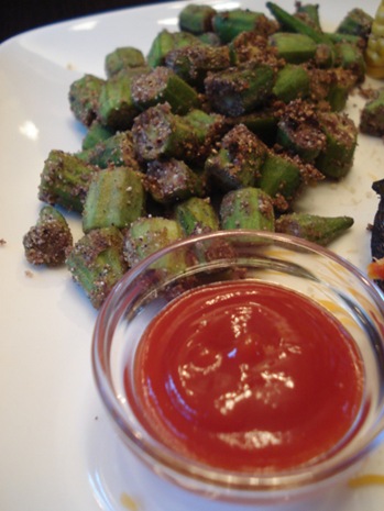 Yep, ketchup on okra. The cornmeal made it kinda like french fries!