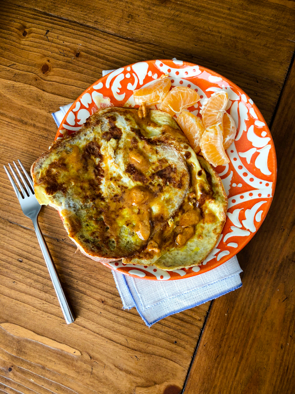 Simple whole wheat French toast: I just crack two eggs in a bowl, add a little cinnamon and a splash of half and half. That’s usually perfect for two pieces of bread, but I do pour the rest of the batter on the final slice and turn it into a French toast omelet.