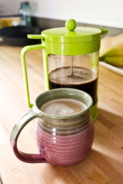 I was nursing the baby in bed yesterday when Matt brought me a steaming cup of coffee mixed with frothy milk. Heaven in a mug, I tell you! [This was actually his – mine was a tiny mug.] I don’t really want to get hooked on caffeine again, but if he’s home to make it for me, I’ll happily enjoy it.