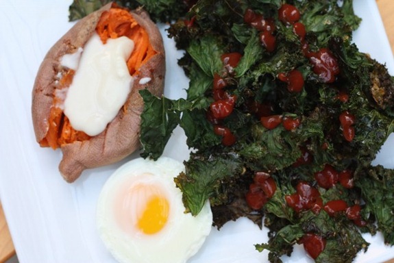I like the idea of Thurs Egg Dinner night. And I love kale chips. And I love, love, love sweet Potatoes. Hmm, check off one night on the dinner plan for next week.