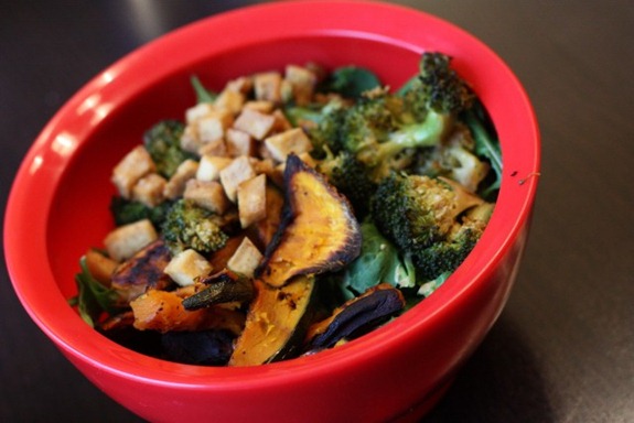 Arugula with my pumpkin seed butter as dressing (I added some warm water to thin it out to dressing consistency) plus kabocha, broccoli and tofu. Yum!
