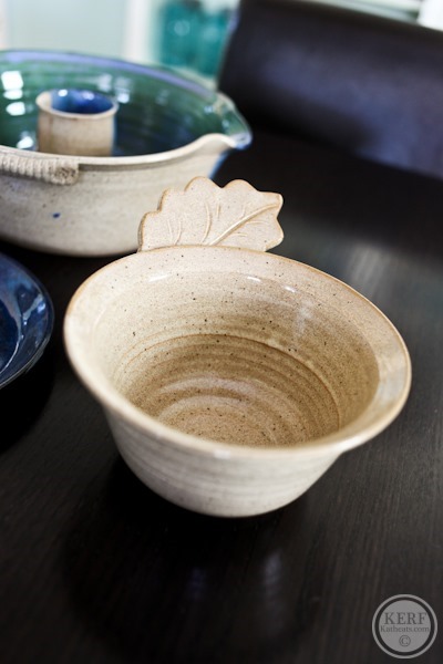 Functional pottery is the best! Friends of mine in Ohio make similar items. I like the bowles with leaves on them; it makes for a unique handle!